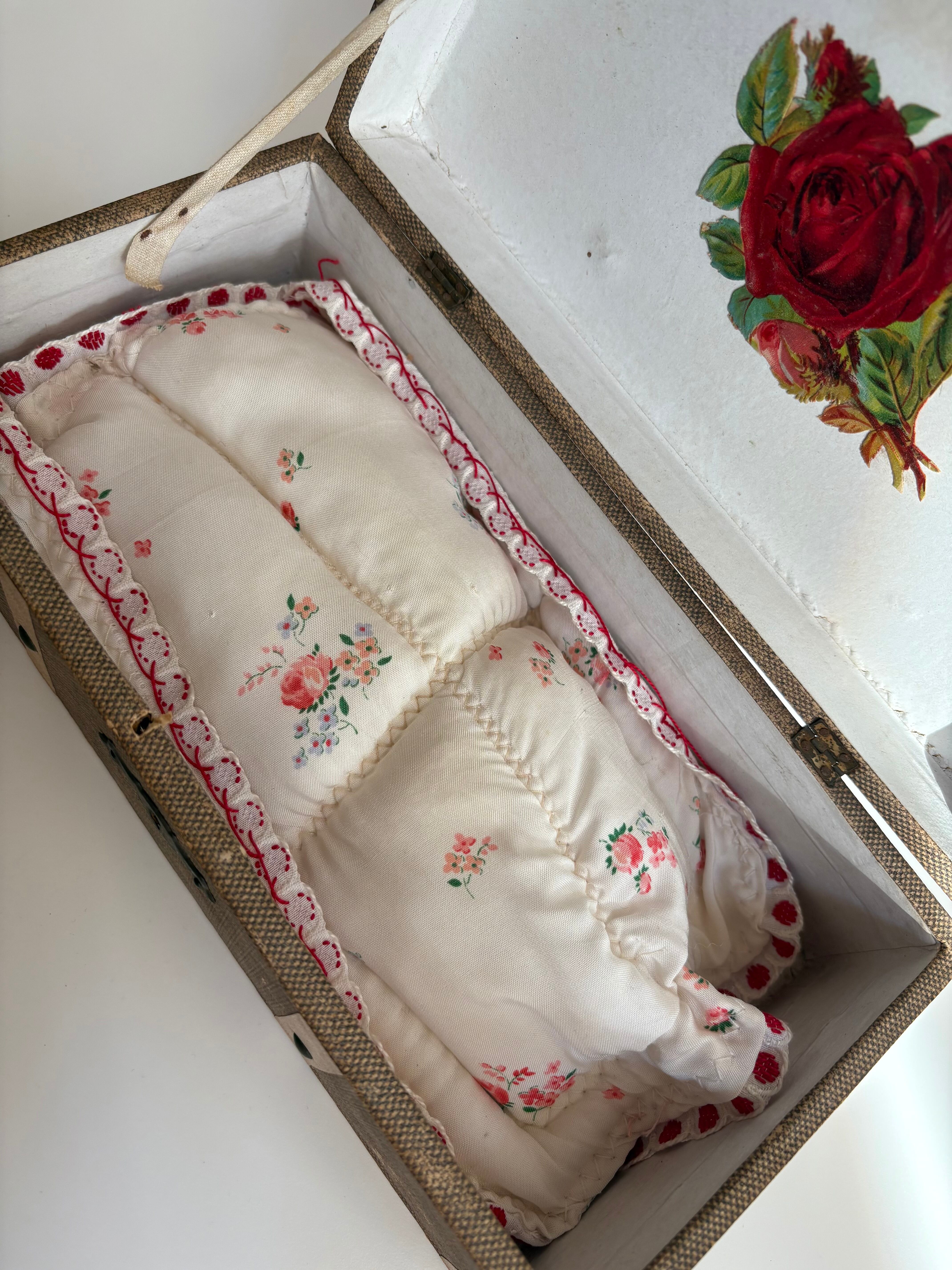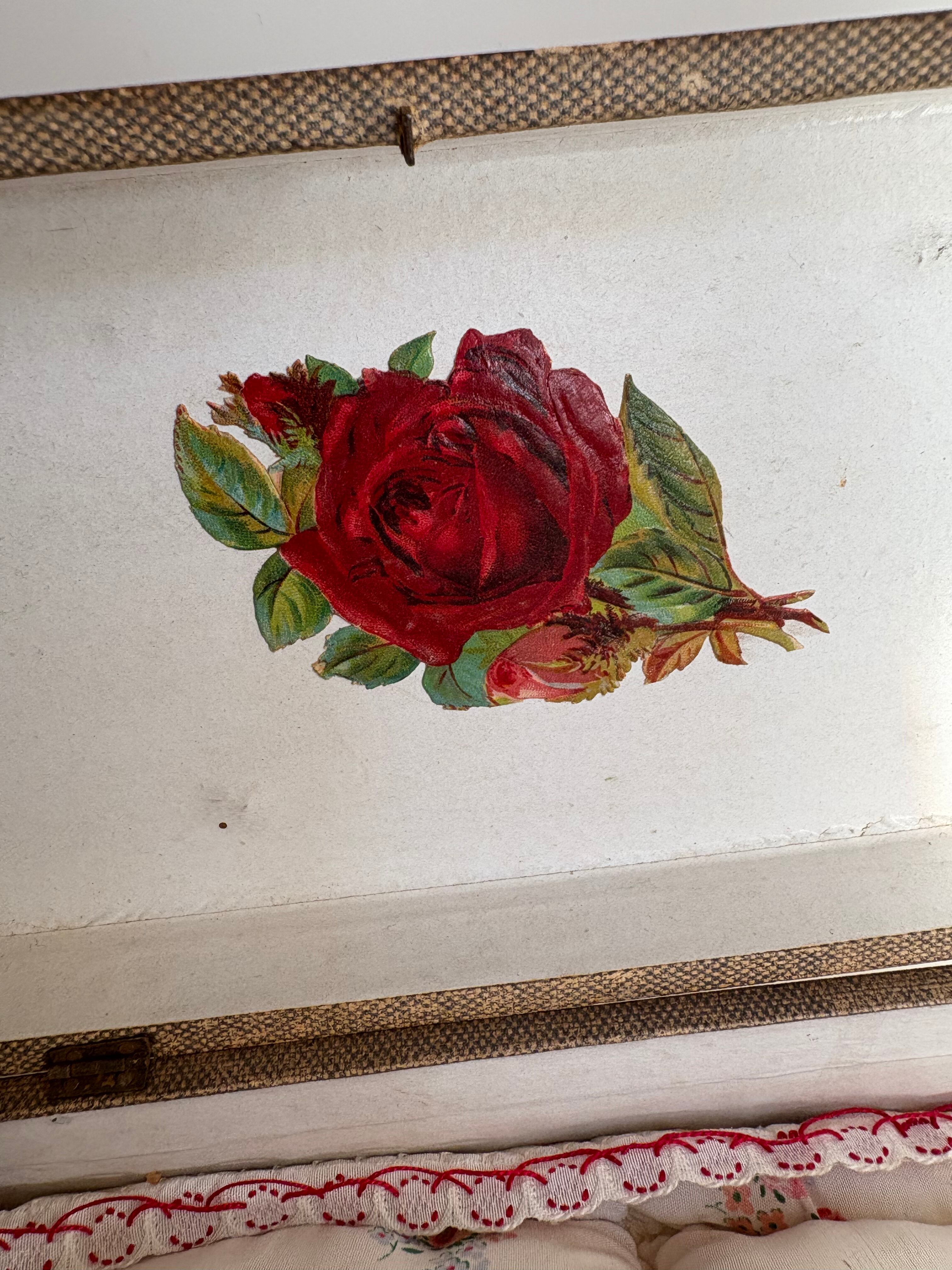箱の内側には薔薇のクロモが愛らしくコラージュされ、