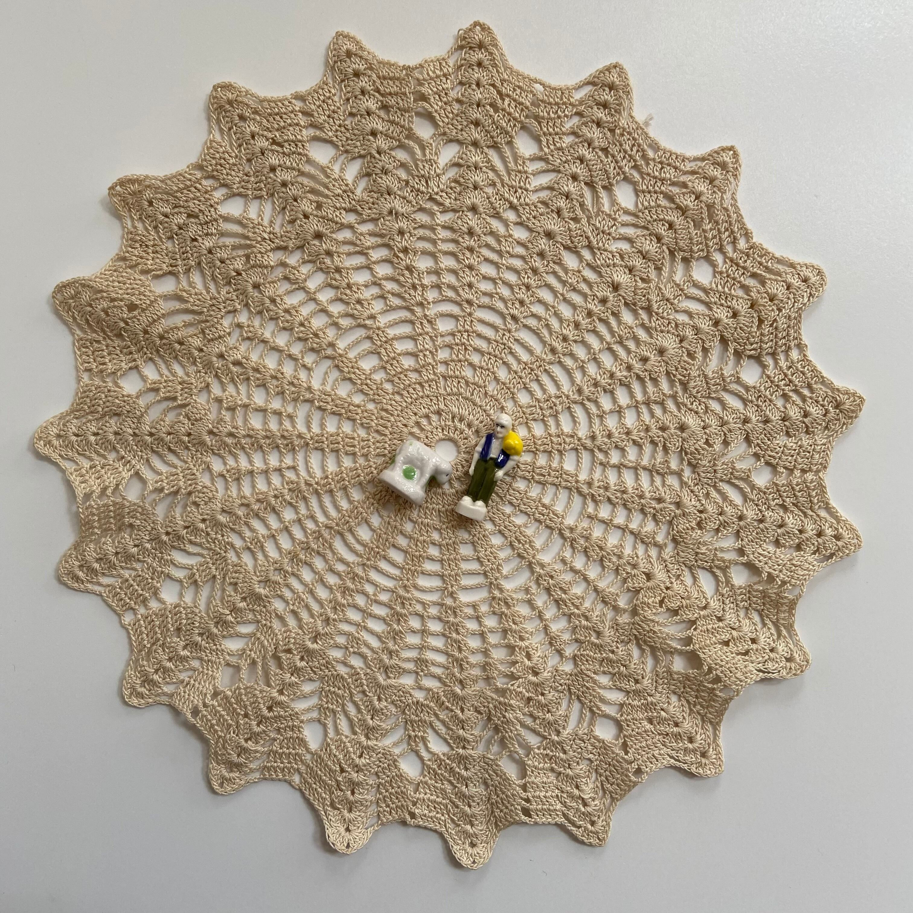 ⨳サイズ <ドイリー> 横幅 約 27㎝、縦幅 約26㎝ <フェーヴ>(農夫) 高さ 約3.3㎝、(羊)高さ 約1.7㎝、体長 約1.8㎝