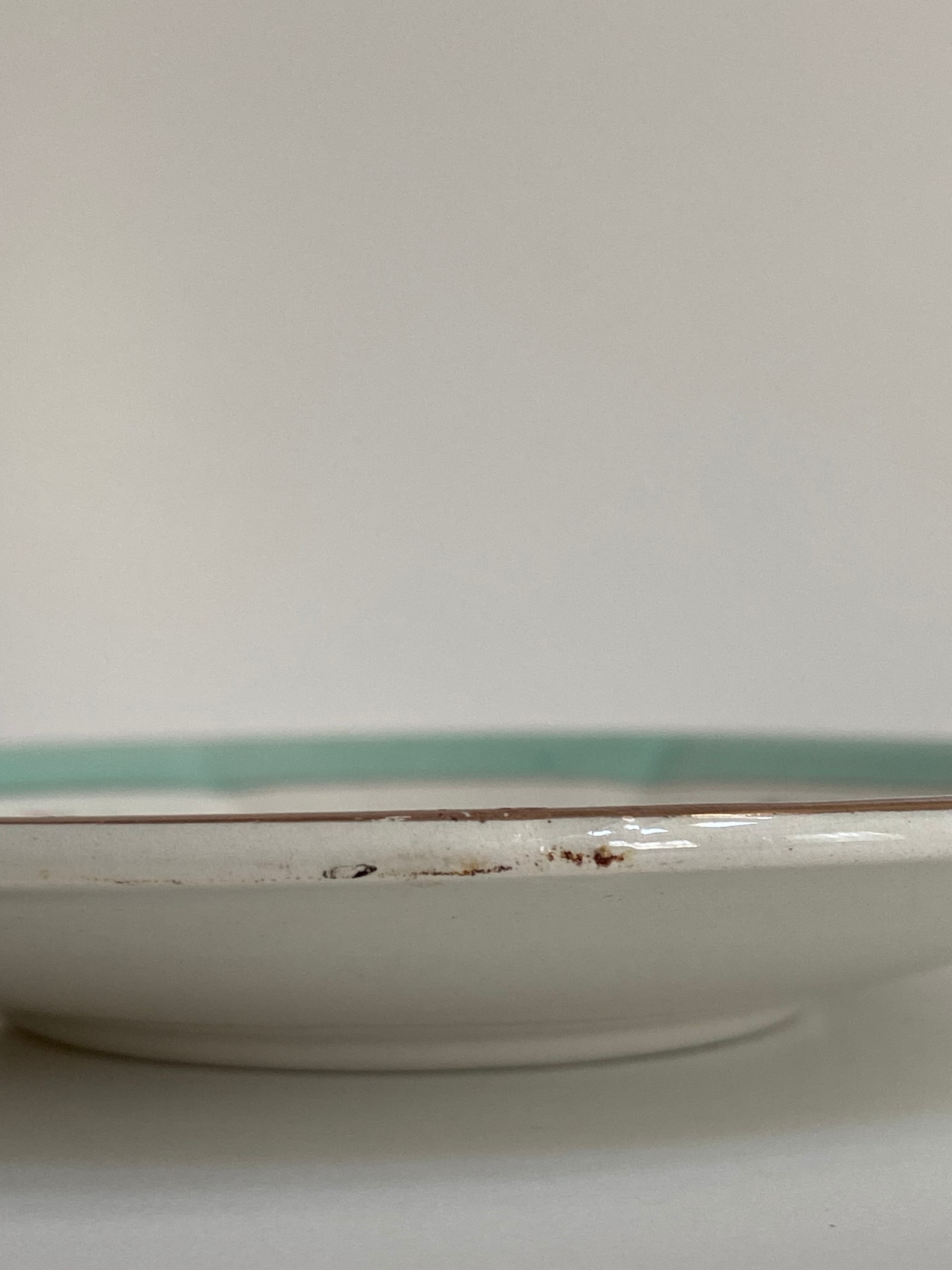 ⨳コンディション カップについて、経年による金縁の擦れ、色付きあり。製造時での膨らみが口縁近くに外側と内側に各一か所、裏面の刻印のところに線の凹みあり。貫入多少あり。ソーサーについて、少しの貫入、経年による柄の削れ、色付き多少あり。